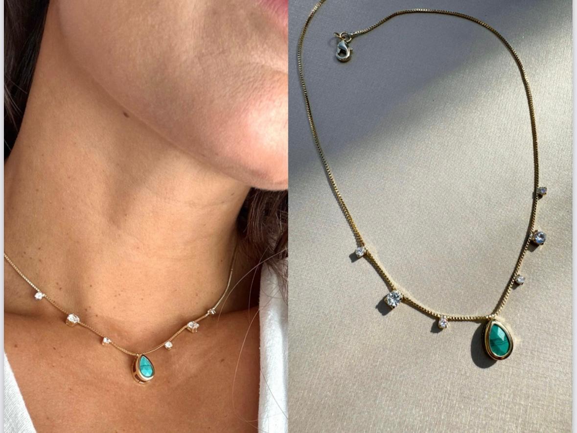 Choker com pedra azul tifanny delicado e zirconias de cristal - Banhado a Ouro 18k
